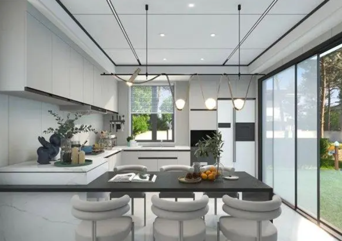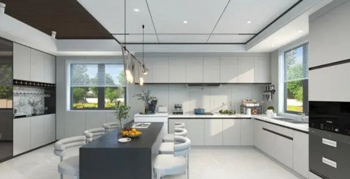 頂部以白色蜂窩大板吊頂,線型燈帶和筒燈相結(jié)合,打造簡約時尚現(xiàn)代廚房。
